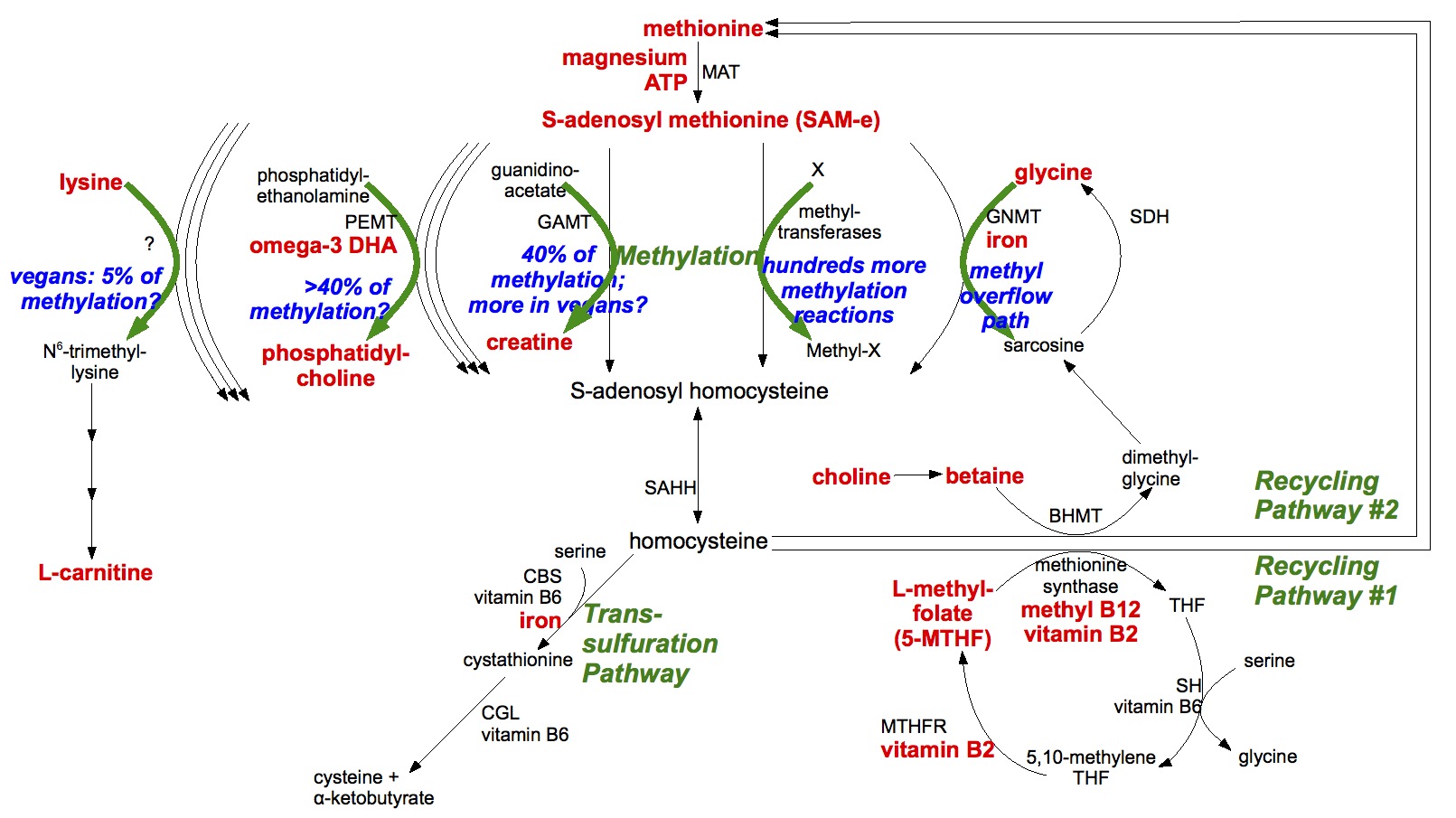 Figure 1. The methylation cycle, highlighting in red substances of interest to vegans and vegetarians. Click for larger image. Sources: Kennedy 2016; Mudd 2007; Wanders 2002.